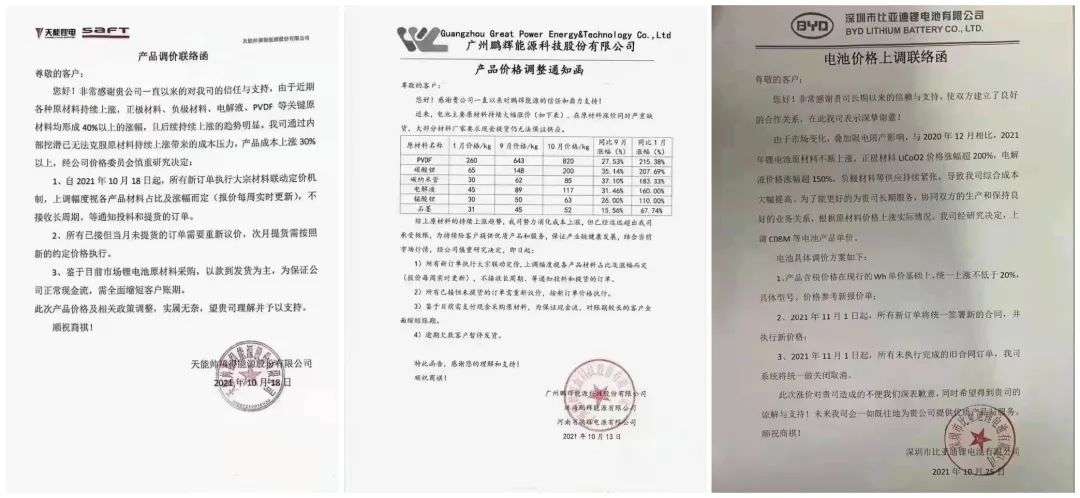 与2020年12月相比,目前正极材料中的钴酸锂价格涨超200%,电解液价格涨超150%等,导致比亚迪综合成本大幅提高。虽然至今比亚迪方面仍对此不予置评,但动力电池涨价的声音已经绵延不绝。包括鹏辉能源、国轩高科、天能锂电、赣锋锂业等多家电池厂商都发布涨价函,对所有新订单执行大宗联动定价。