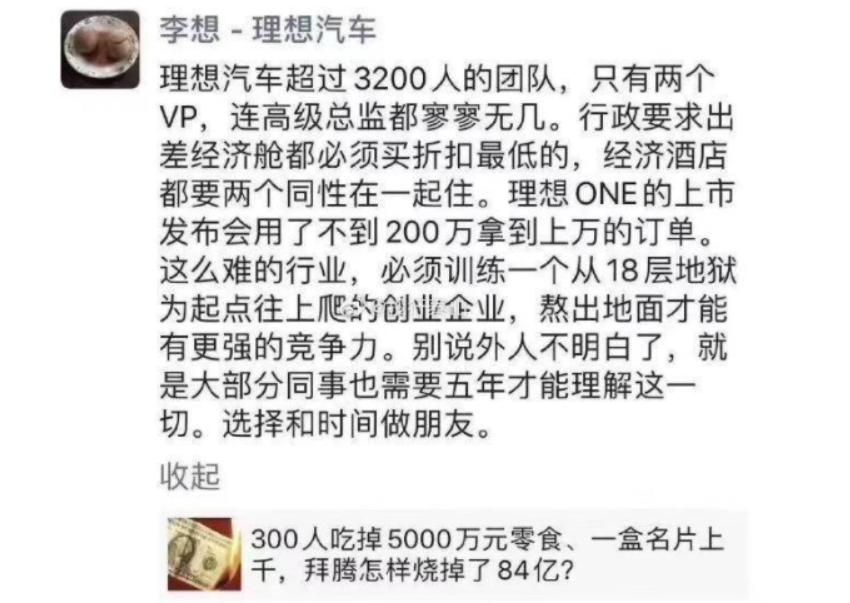 然而,在两年之内暴富的拜腾汽车既没有学会“理财”,也没有替华利汽车还债,它的资金基本都没有用在刀刃上。在花钱这方面,以节俭著称的理想汽车创始人李想曾经转发了一篇名为《300人吃掉5000万零食、一盒名片上千,拜腾怎样烧掉了84亿》的文章。