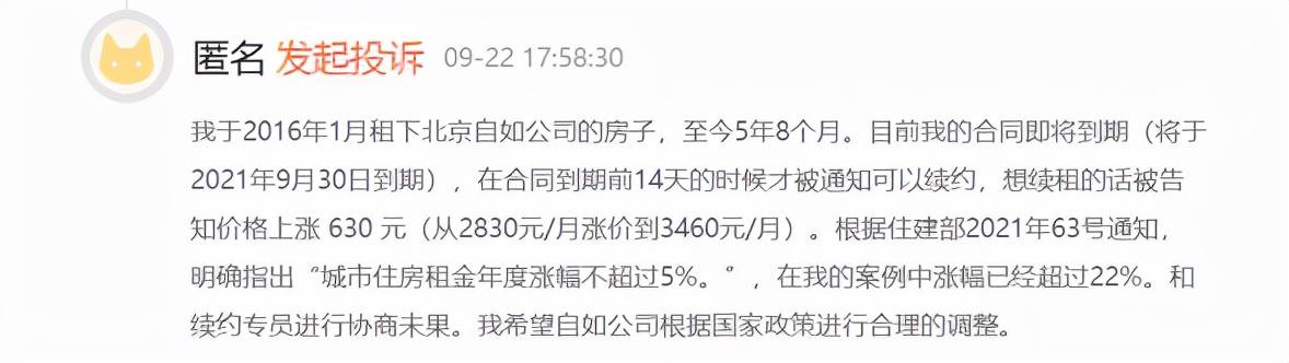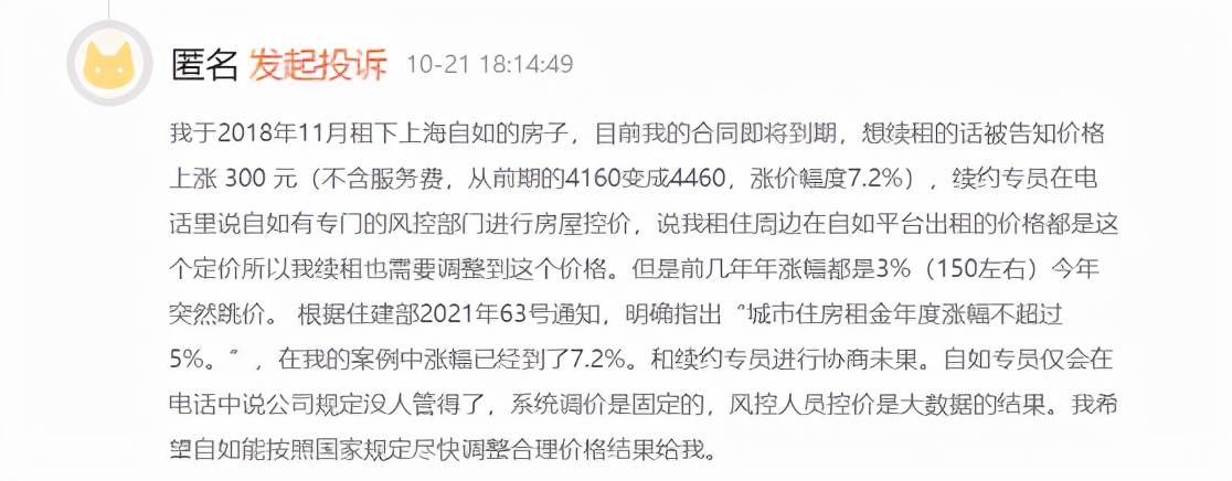 在新浪黑猫平台,有租户反映,其在一些平台续租的价格涨幅达到22%,远超住建部规定的“城市住房租金年度涨幅不超过5%”;上海自如的租户也有反映其今年涨幅达到7.2%,不符规定;有租户也将自己现居的租金价格和续租价格进行了对比。