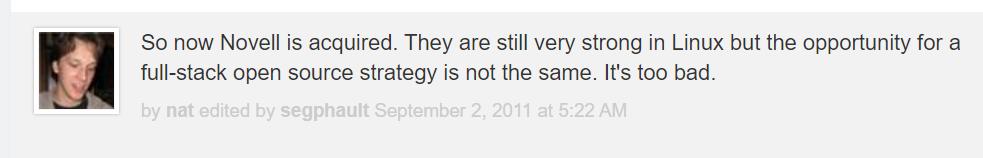 当时他在网友互动时表示,「Novell被收购了,他们在Linux上仍然很强,但说到在全栈开源策略上的机会则是另一回事了,太遗憾了」。