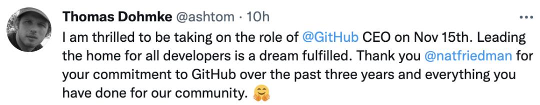 所以,我很高兴地宣布,自 11 月 15 日起,GitHub 的首席产品官 Thomas Dohmke (@ashtom) 将成为首席执行官,而我将改任名誉主席。