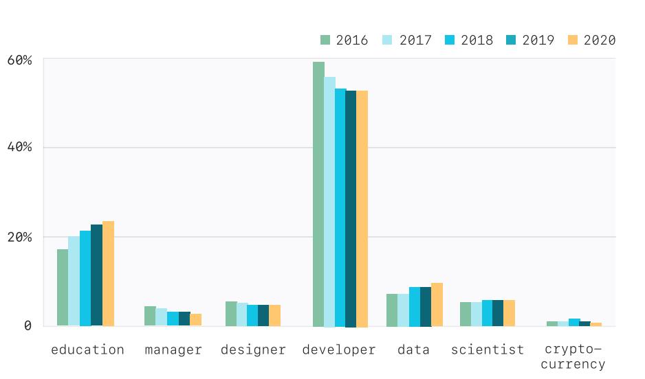 相反,学生成为用户中的主力。教育相关的学生用户、教师用户的比重在不断的攀升,到 2020 年,教育相关用户的比例已达 23%,几乎达到了 Github 用户比重的四分之一。
