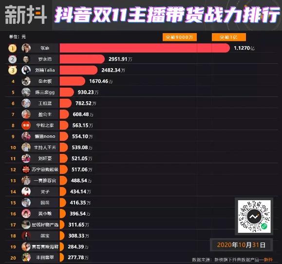 对营销之道颇有心得的张庭,在直播时代到来时,也牢牢抓住了风口。根据新抖公布的2020双11主播带货能力排行榜,2020年6月10日晚,张庭首次抖音直播,创下2.5亿元的营收,当天就妥妥坐上抖音“带货一姐”的位置。