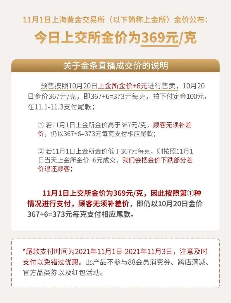 “能保值、更划算”也成为金条的主要卖点。今年双11,薇娅和李佳琦就利用金价实时波动的特点,玩起了“保价”玩法:产品的售价以10月20日预售当天的上交所金价为基准,在付尾款当天,若金价下跌,消费者将获得相应的退款,若金价上升,则无需额外支付。