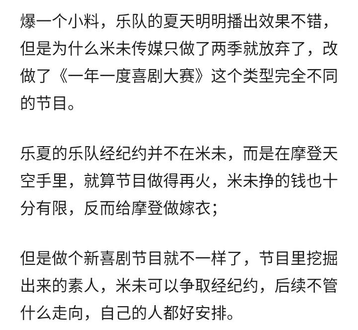 前段时间,文娱圈从业者在脉脉吐槽,今年之所以没有《乐队的夏天》第三季,并非官宣的“暂停一年”,而是因为出品方米未传媒挣到的钱十分有限;相反,近日团队大推的《一年一度喜剧大赛》,才是米未传媒挣钱的希望。