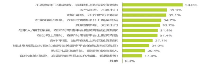 一般来说,消费者在不同消费场景下选择即时零售的原因主要包括:省事、不方便出门、送礼、急需等。但“即时性”表现得也并不稳定,将即时零售逐渐全品类化,实现“万物到家”,打通电商B2C模式,或许是“即时性”与计划性有效结合的契机。
