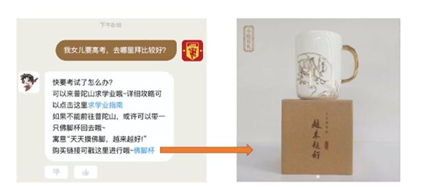 在普陀山景区,我们基于智能客服的算法推荐模型,定制了文创商品“佛脚杯”。因为普陀山有深厚的佛教文化背景,“与其临时抱佛脚,不如买个佛脚杯天天捧着”。利用消费引导场景,自然而有效带动佛脚杯文创产品的销量。