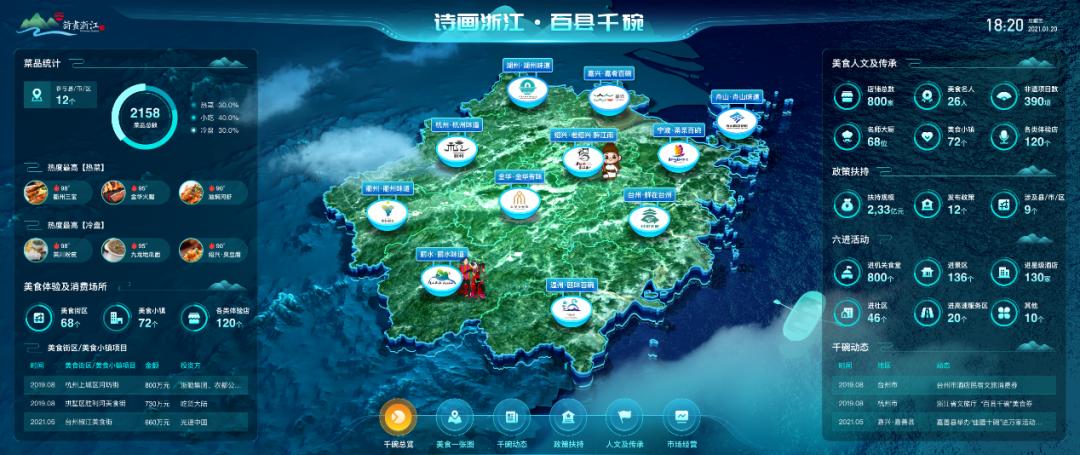 2020年,力石承接了浙江省“百县千碗”数字化平台的建设工作,推动全省建立“百县千碗”大数据中心。通过SaaS化的方式,力石实现了地市、区县、景区、乡镇、行政村数据贯通,打通政府、景区、文旅集团、涉旅小微企业,让文旅数据真正产生价值。