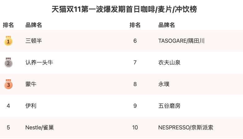 新品牌们还欠缺一个最佳赛道、最好的时机,后来蜂拥而上的新品牌鲜有跑出来的,而第一波出来的新品牌目前还能保持一个好姿态。如在今天天猫双十一的第一波榜单中,很多新消费品牌已经不复存在,但有几个新品牌已登上了大类目榜单,亿邦动力的金榜显示,在咖啡/麦片/冲饮类目中,三顿半、认养一头牛、隅田川、永璞都在TOP10榜单中,尤其三顿半、认养一头牛排在首位,超过了蒙牛、伊利和雀巢一众大品牌。