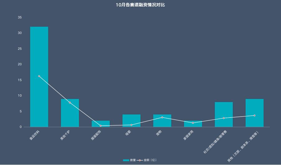 具体来看,在10月份的投融资数量中,只有食品饮料赛道遥遥领先,在数量上,是第二位的美妆个护赛道的3倍之多,金额也超过2倍。