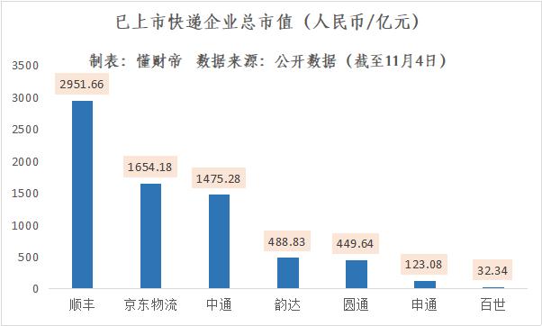 市值方面,截至11月4日股市收盘,顺丰市值为2951.66亿元,京东物流为2012.56亿港元(约合人民币1654.18亿元)。
