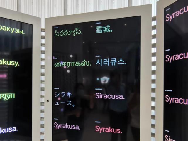 无法忽视的亮点:Google Imagination Space,五米多高的圆形封闭空间,外面是圆柱形玻璃管形成的光影折射。展示了非常强大的谷歌翻译器,与体验者的互动感极强,随意说一个短语,就瞬时翻译成24种语言,同时展示在交互屏幕上,感受到科技魅力的人类纷纷拍照留念。
