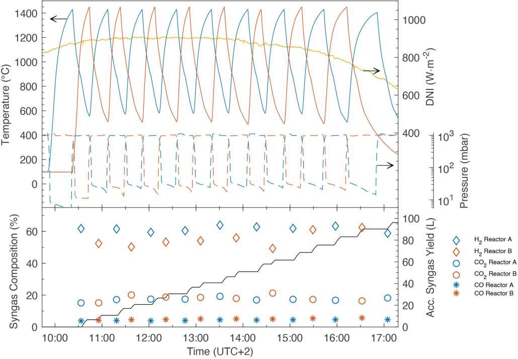 太阳能氧化还原装置中心的循环包括两个步骤:在第一吸热步骤中,二氧化铈热还原生成氧气,在第二放热步骤中,还原的氧化铈用二氧化碳/水分子重新氧化,分别生成一氧化碳或氢气。燃料(氢气、一氧化碳)和氧气分别在单独步骤中生成,从而避免形成爆炸性混合物,无需高温气体分离,研究人员采用温度和压力波动来最大化氧化铈的氧交换能力,从而提高每循环的燃料产量。