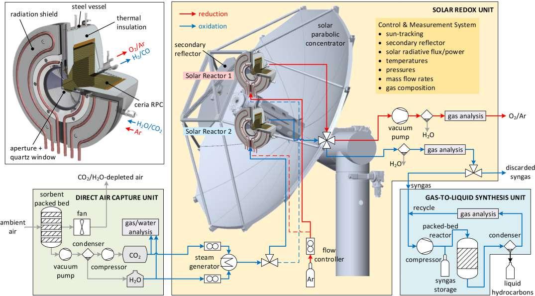 科学家们尝试了许多可能的方法,其中,使用浓缩太阳辐射作为高温过程热源的热化学路径潜在具有高生产率和有效性。进一步而言,如果实验所需的二氧化碳能直接从大气中获得,则可以提供真正意义上的碳中和燃料,如果水分子也能从空气中共同提取,那么原料来源和燃料生产可以集中在阳光照射强烈、水资源有限的沙漠地区进行。