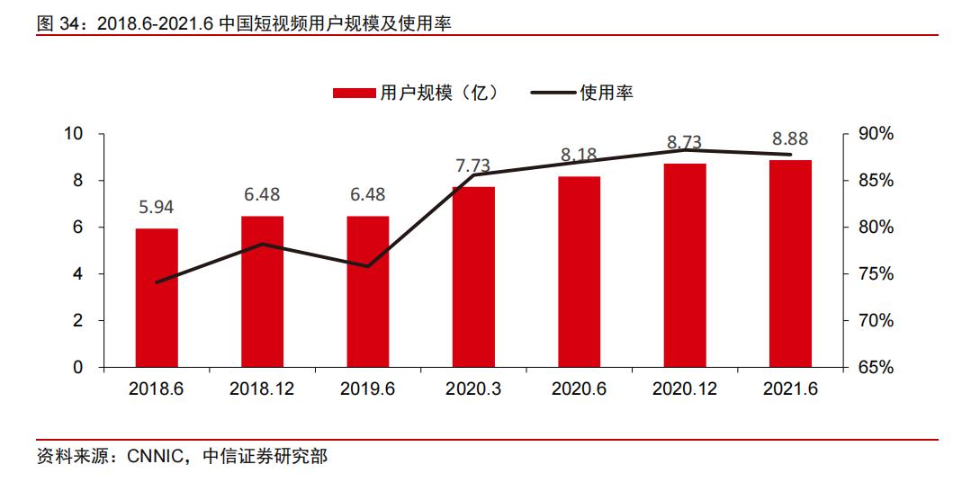 根据CNNIC数据,截至2021年6月,我国短视频用户规模为8.88亿,同比增长8.5%,使用率已提升至87.8%,实现高度渗透。