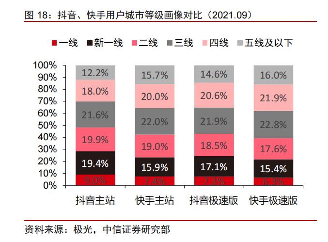 用户圈层的固化仍然是抖音和快手难以突破的牢笼,中信证券研究数据显示,截至2021年9月,抖音/快手用户中与对方重合的占比分别为48%/84%左右,且抖音和快手用户画像各有侧重。