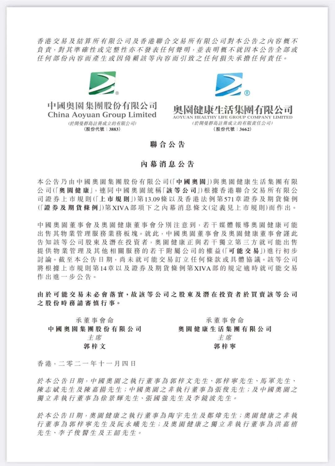 中国奥园也未能幸免,选择了“断臂”求生。11月4日晚间,中国奥园、奥园健康发布联合公告称,奥园健康正与若干独立第三方就可能出售提供物业管理及其他相关服务的若干附属公司的权益进行初步讨论。