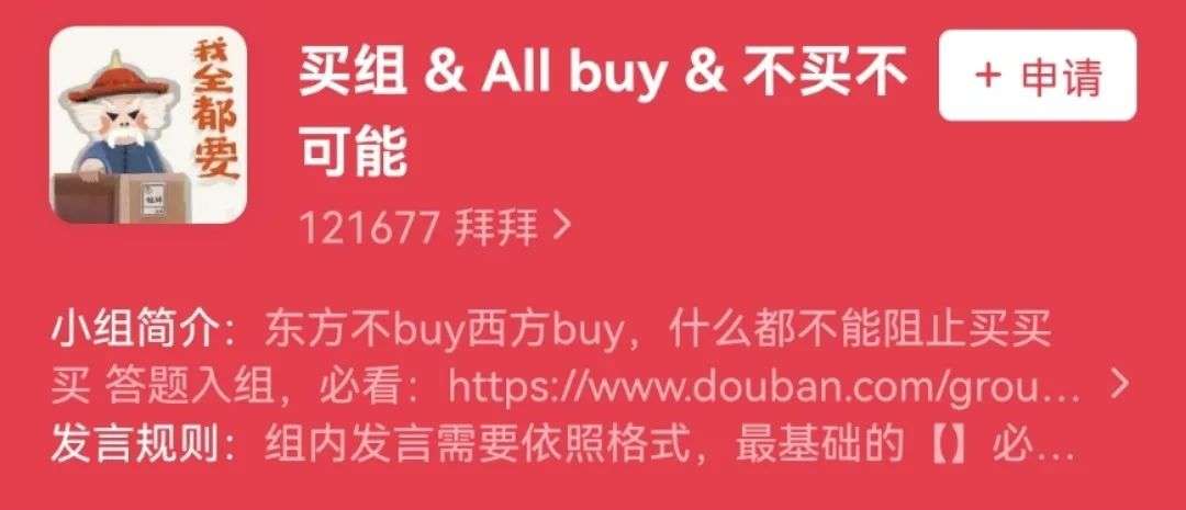 某瓣有众多买组,他们在小组简介中写着,“东方不BUY西方BUY,什么都不能阻止买买买”。