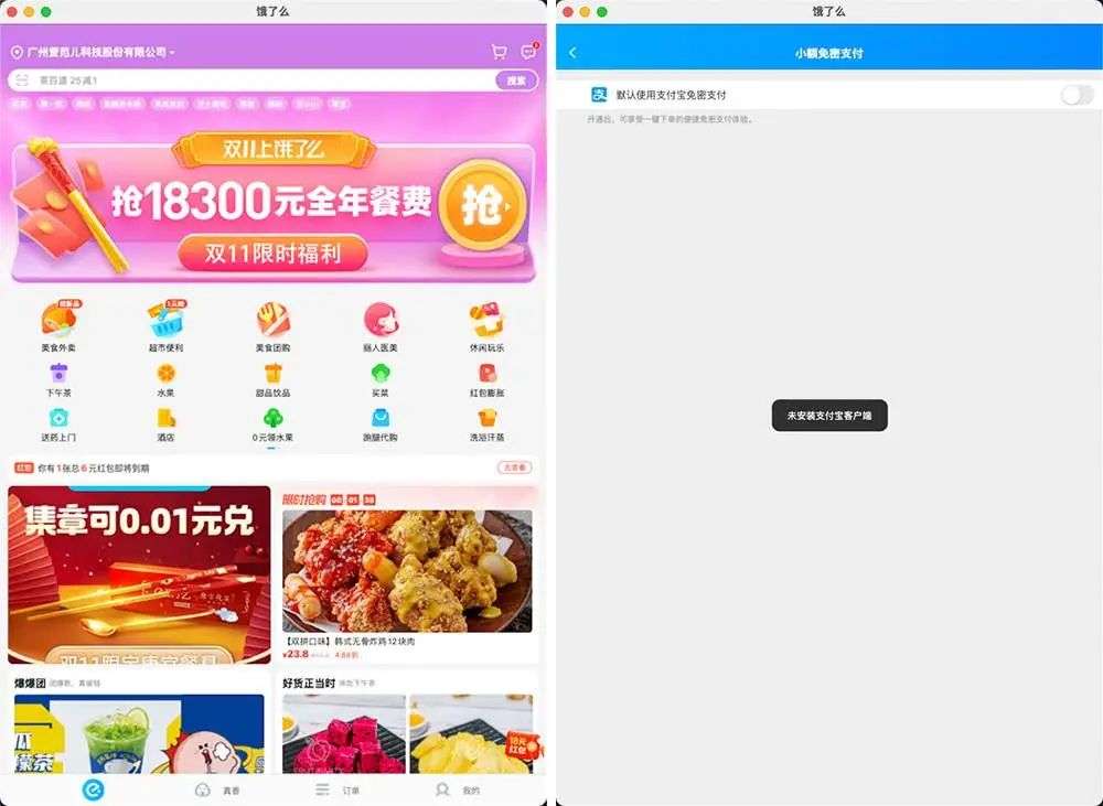 我们还尝试用电脑购物,在《饿了么》成功下单后,却要跳转到浏览器中登录支付宝付款,因为无法安装支付宝,在 app 中是无法开启支付宝免密支付的。