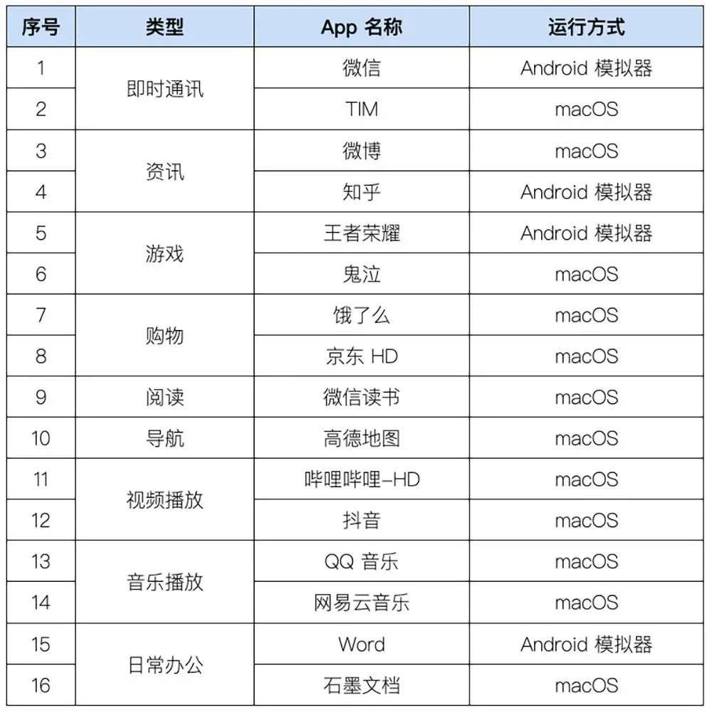 根据前面提到的电脑端运行手机 app 的现状,如果能在 macOS 上安装,就在 MacBook 上进行测试;没有的话就使用 Windows 平台的 Android 模拟器来体验,具体 app 和测试平台如下图所示。