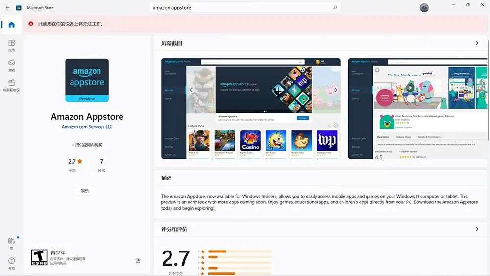 这样才能在 Microsoft Store 中搜索到 Amazon Appstore 并下载安装 Android app,否则即使进入了应用商店界面,也只能看到「此应用在你的设备上将无法工作」的提示。