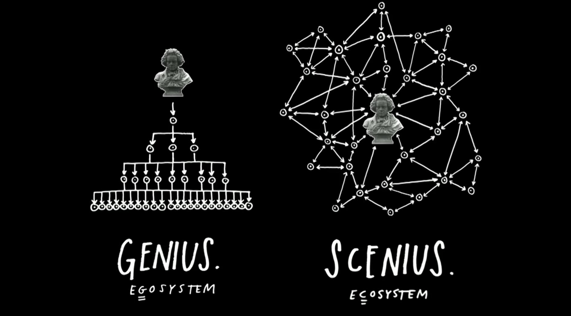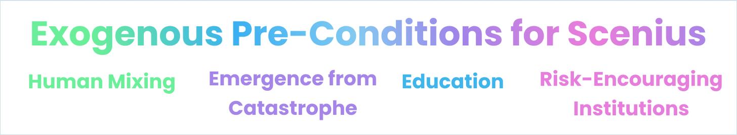 这四个因素——人员交融、新的教育模式、鼓励冒险的机构,以及灾难——为 Scenius 奠定了基础。然后内生因素开始接管,接下来就由场景来发挥影响。