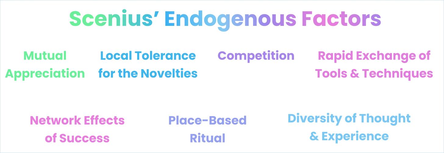 有了这十一个因素(四个外生,七个内生),就可以把一群人变成一个 Scenius,一个在一系列学科取得更多成就的社区,而不是一群拥有同样才能的人。