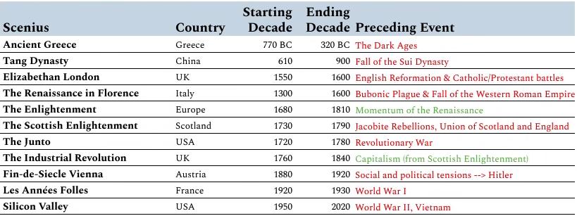 古希腊时代是跟在希腊黑暗时代(也就是青铜时代崩溃后那 350 年的时间)之后出现的。从二战到麻省理工学院20号楼、从贝尔实验室到硅谷,你可以在它们之间画一条直线。共读社(Junto )源自独立战争。文艺复兴始于西罗马帝国衰落与黑死病之后。上表仅有的两个不是劫后重生的Scenius,也是利用了之前的 Scenius 的势头,并将其输出作为自己的构建块。