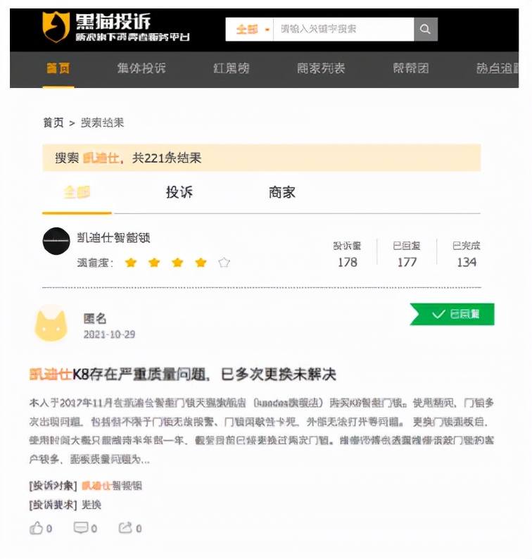 在新浪旗下“黑猫投诉”平台,关于凯迪仕的投诉为178条,问题多集中在智能门锁质量、售后服务等方面。