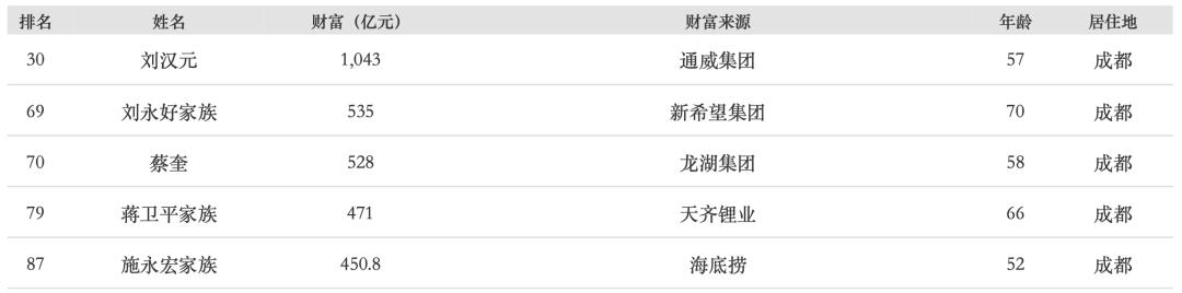 作为西部城市的成都,此次表现亮眼,有5位富豪上榜。