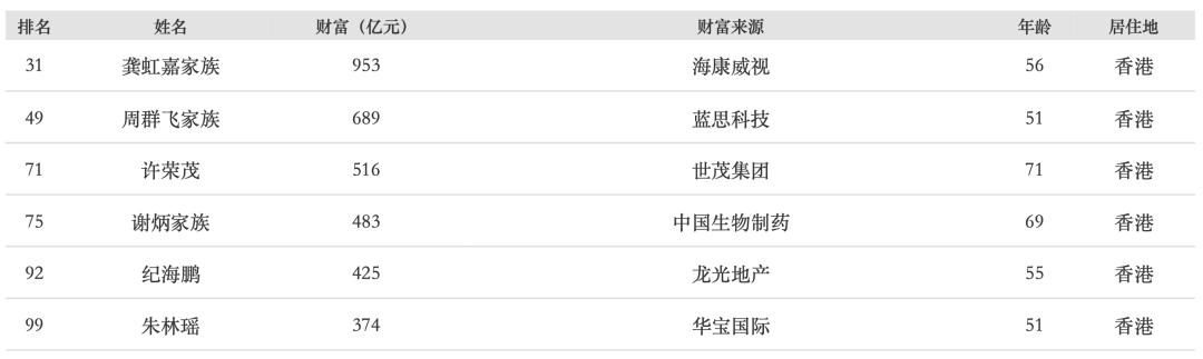福布斯的信息显示,共有6名内地富豪的居住地是中国香港,他们掌控的企业总部,大部分都在内地城市,包括杭州的海康威视、长沙的蓝思科技、深圳的龙光地产。