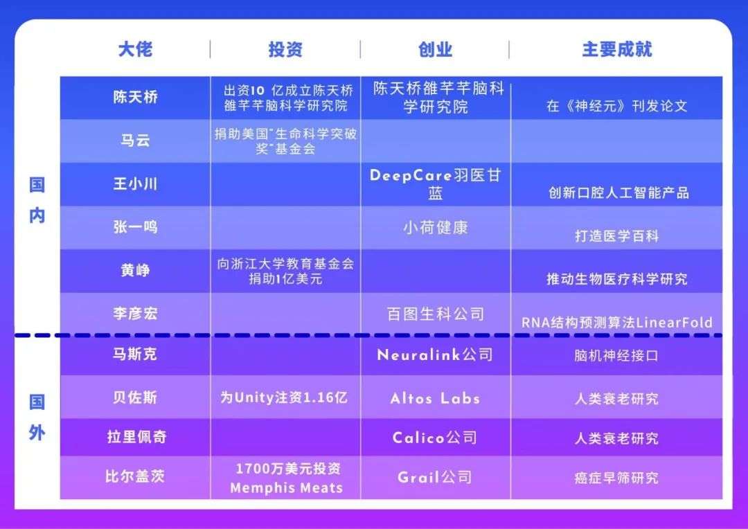 大佬们对生命科学的热爱八九不离十,但进军生命科学的路线,可以说是八仙过海,各显神通,有钱的出钱,有力的出力: