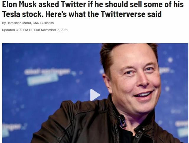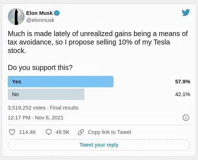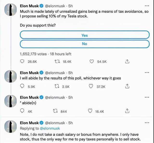11月7日,马斯克在推特上发起了一项民意调查,询问其6250万粉丝他是否应该出售10%所持有的特斯拉股票。并表示:“最近有很多人认为未实现收益是一种避税手段,所以我建议出售10%的特斯拉股票。你们是否支持这项提议?”