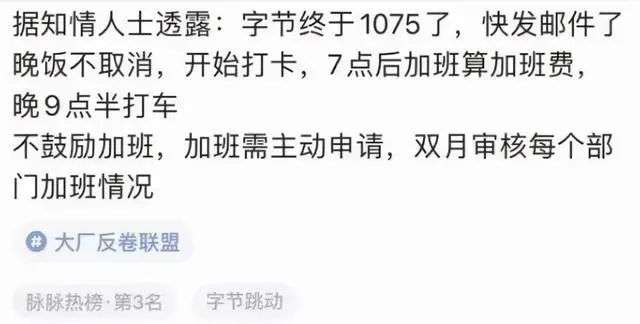 也有网友爆料,阿里旗下部分分公司早已执行了一段时间“1075”工作制了;而10 月底,华为也在内部宣布不准私自加班,HR甚至会在 6 点开始撵人下班。