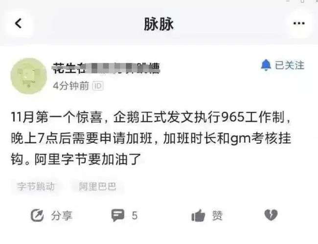 无独有偶,在字节跳动传出“1075”工作制调整后,腾讯也被媒体爆料将采用“965”工作制,即9点上班,6点下班,工作5天,而且下班后员工加班也需要申请,且加班时长与领导的绩效考核挂钩。