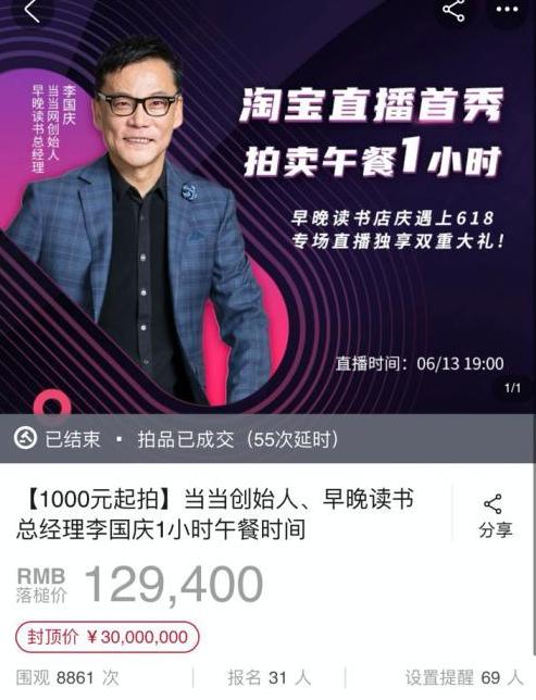 此外,他还致敬前辈巴菲特,卖掉了一次共进午餐的机会。原定于8点半结束拍卖的“李国庆午餐1小时”,在经过55次延时(延时周期2分/次)后,最终以12.94万元成交。