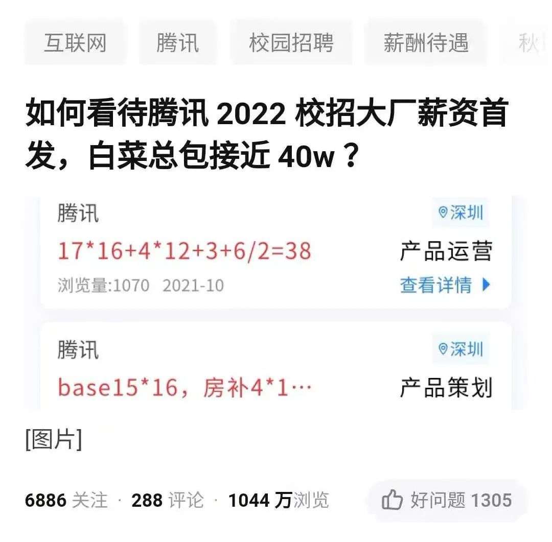 在职场社交平台脉脉上,“薪资倒挂”拥有超过450万的讨论热度,腾讯还因今年校招薪资过高上了知乎热搜。根据大学生互联网求职平台offershow的调研显示,腾讯2022届校招待遇普通水平技术岗最低月薪约1.9万,对比去年涨了2000左右,一线城市住房补贴直接从去年每月1500涨到每月4000,再加上6-10万股票和3万左右签字费等各种收入,最终指向了“腾讯校招技术岗员工最低年薪接近40万”。