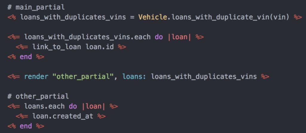 我刚开始做软件开发人员的时候,当时是在一家做车贷的金融科技初创企业工作。我写了一个查询,用来查找任何具有重复 VIN(车辆识别号)的车辆,然后在贷款批准流程把相关的车牌提取出来。代码看起来大概像下面这样: