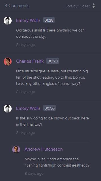 而不同在于,在Frame.io中,整个团队都可以同时访问视频,也可以依据权限实时修改、讨论视频。在点进某一视频之后,用户可以在右侧看到大家关于视频的讨论,每条讨论都会被自动加上时间戳,点击讨论就可以直接定位到评论位置,非常清晰便捷。