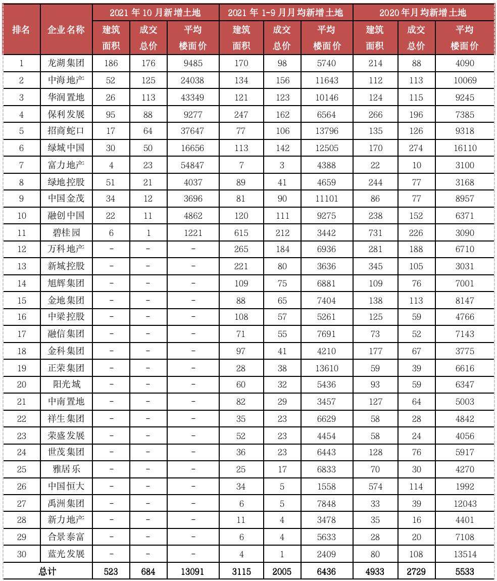 表:2021年10月30家监测企业新增土地统计表(单位:万平方米、亿元、元/平方米)