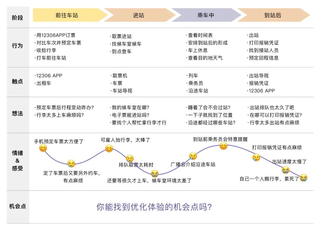 下面是一个用户使用 12306 App 的乘车过程体验地图,从里面你可以全面清晰地看到不同阶段的用户体验变化过程。