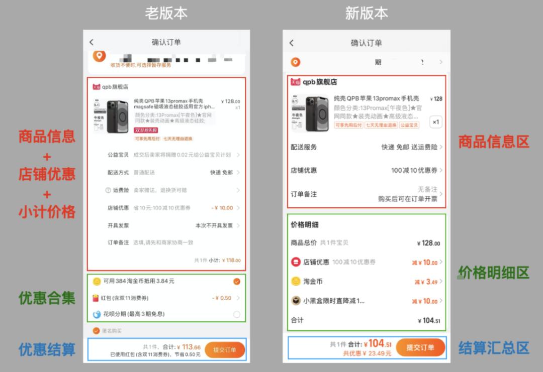 在文章里我也提到了,淘宝结算页的这个改版实际上是对产品框架层和表现层做了调整,从而达到提升订单转化率的效果。