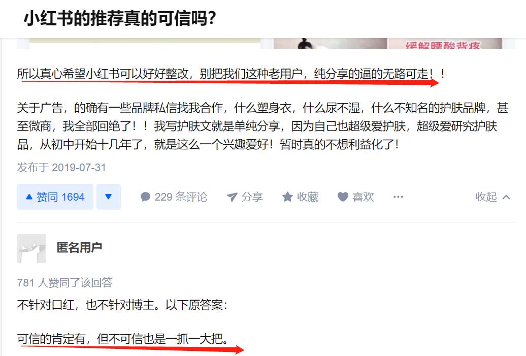 在知乎上,有一个“小红书上的广告可信吗”的提问,前排的高赞回答画风高度统一:“小红书广告可信的肯定有,但不可信的也是一抓一大把”、“用户体验非常差,对于真正的广告还有纯分享这两个分不清”……