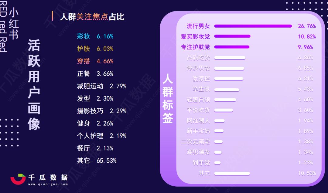 千瓜数据发布的小红书活跃用户画像就显示,彩妆、护肤、穿搭、美食和运动健身是小红书用户们最关心的话题。