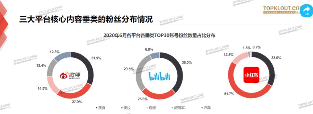 尤其是美妆和美食量达到垂直领域,在小红书头部博主中的占比远超微博、B站等内容社区。根据克劳锐统计的数据,小红书美妆和美食类Top 30账号粉丝数占比分别为51.7%和33%,占据了大半壁江山。
