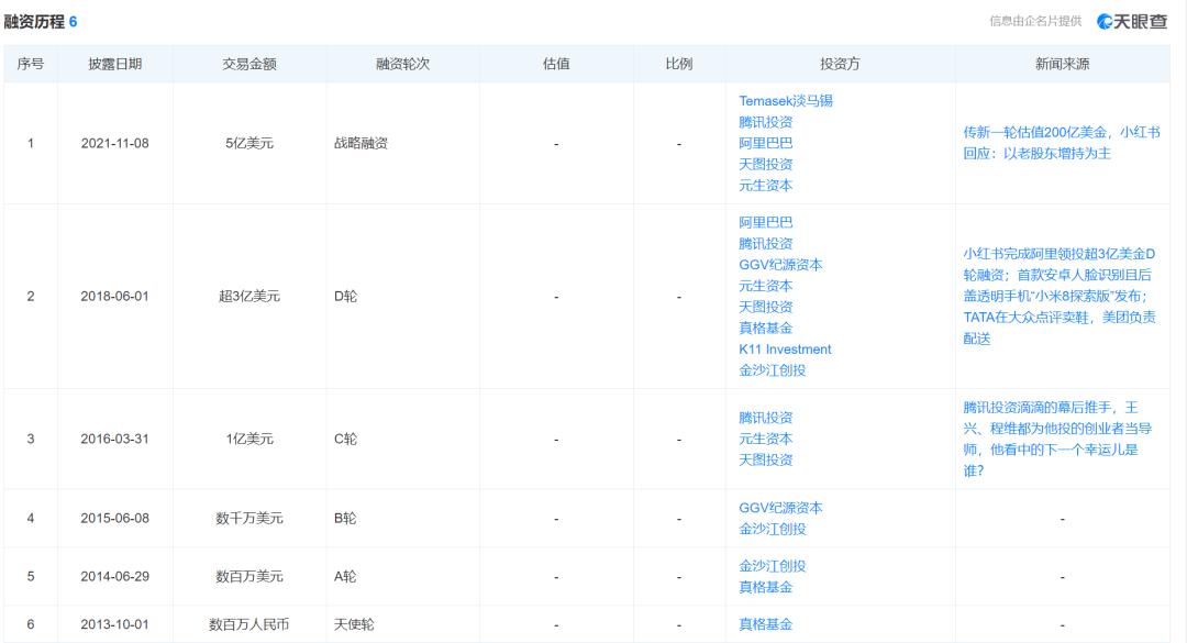 价值研究所(ID:bttimes)翻查天眼查的数据显示,小红书目前一共完成了6轮融资,上一轮融资出现在2018年6月份,股东名单里同样有阿里巴巴、腾讯、元生资本和天图投资这几个熟悉的面孔。