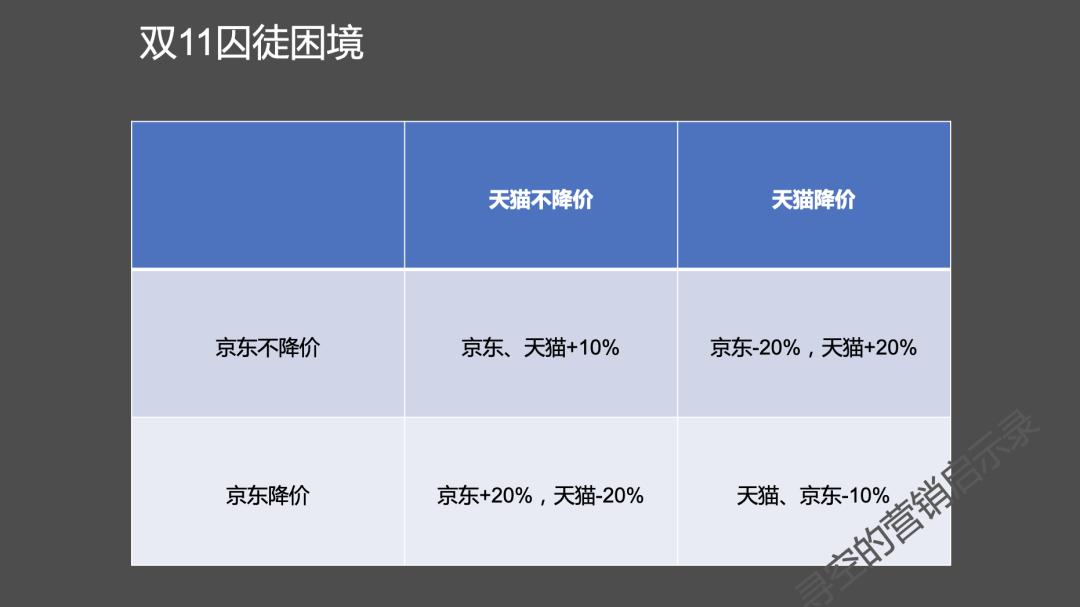如上文所说,对于天猫和京东来说,如果二者在双11前能够默契地达成不降价的一致,则竞争的内卷就能避免。