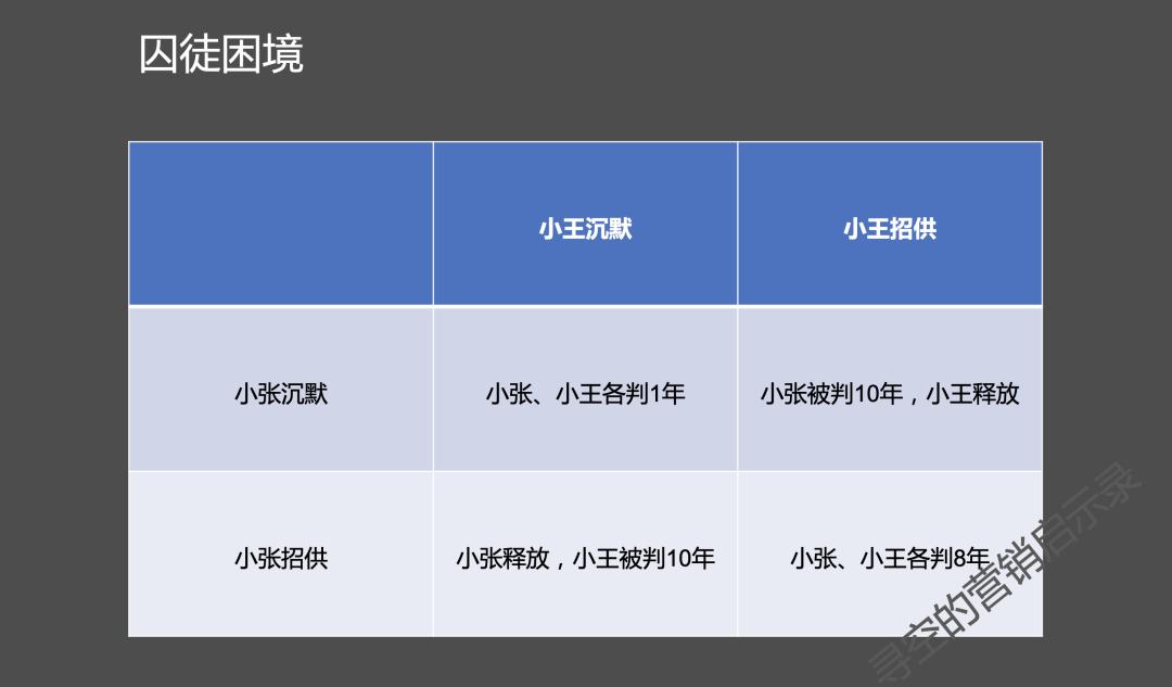 几天后,小张和小王在同一个监狱里被监禁,某一天两人出来放风,说起了当天的情况,二人话音刚落,就如梦初醒般大叹:咱俩应该都选择沉默啊!