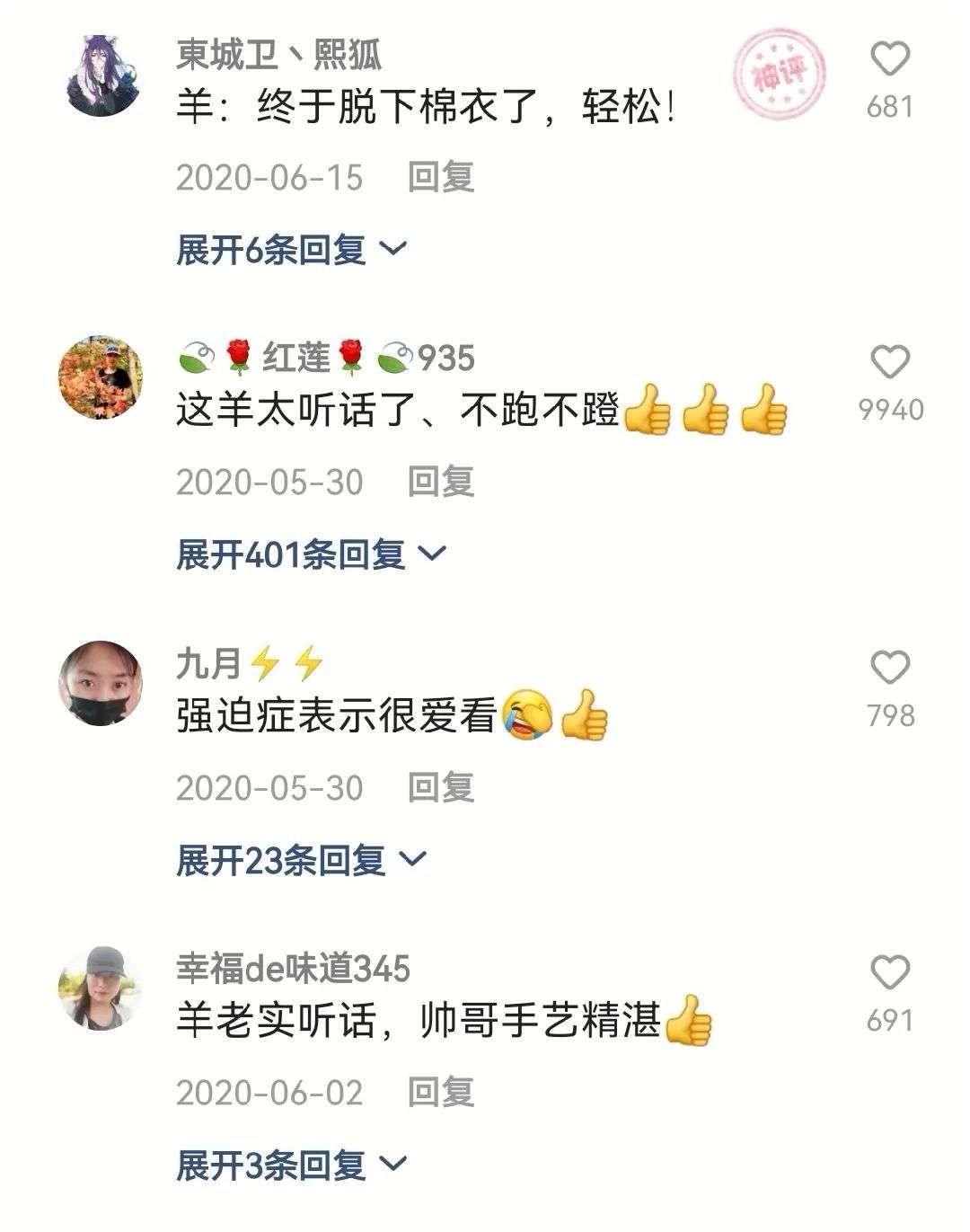 从未见过剪羊毛的观众,怀着好奇心看完了整个视频,由衷赞叹道:“这羊好听话!”“帅哥手艺精湛!”“治好了我的强迫症!”