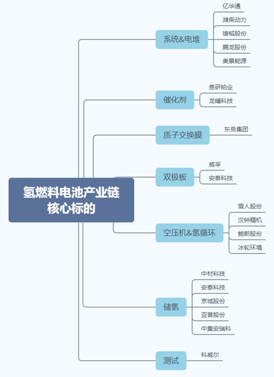 在A股市场,氢燃料电池产业链有哪些相关公司呢?我们来看一下。